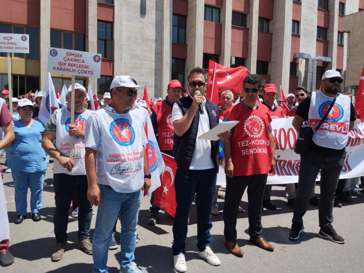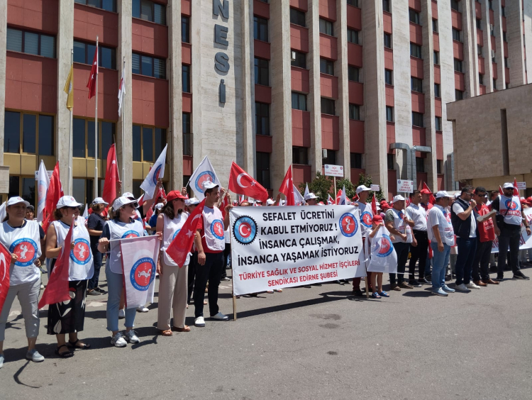 Edirne’de TEZ KOOP-İŞ ile Sağlık-İŞ Sendikaları hükümet ile sendikalar arasında yürütülen Toplu İş Sözleşmesi süreci hakkında bugün Trakya Üniversitesi Tıp Fakültesi Hastanesi önünde basın açıklaması düzenlediler. Sağlık-İş Sendikası Edirne Şube Başkanı Özcan Özdemir tarafından okunan basın açıklamasında hükümetin sunduğu teklifin kabul edilemez olduğu belirtildi. Özdemir açıklamasında bu işin sonunun greve kadar gideceğini söyleyerek; “Buradan, işyerlerimizin önünden hükümete açık ve net carimizdir. Kamu toplu is sözleşmesi sürecinde biz işçiler; sosyal diyaloga dayalı, şeffaf ve çözüm odaklı bir yaklaşım görmek istedik. Ama ne yazık ki siz, işçinin sabrını sınadınız. Üç ay boyunca masaya hiçbir teklif getirmediniz. Uyardık: ‘Geçim şartları her geçen gün zorlaşıyor’ dedik, görmezden geldiniz. Sabırla çözüm bekledik. En sonunda ise zar zor, emeğimizi yok sayarak lütufmuş gibi bir teklif sundunuz. Biz emekçiler emeği yok sayan bu teklifi birikin kabul etmeyi, dile bile getirmeyeceğiz. Ne siz o teklifi vermiş olun, ne de biz duymuş olalım. Maaşlarımızla bir ay değil, bir hafta bile geçinemiyoruz. Kiralar uçmuş, faturalar almış basını gidiyor. Uykularımız kaçıyor. Çocuklarımızın beslenmesini, kitap-defter masrafını karşılayamıyoruz. Geçim sıkıntısı bugün kamu işçisinin en can yakıcı sorunu haline gelmiştir” dedi.