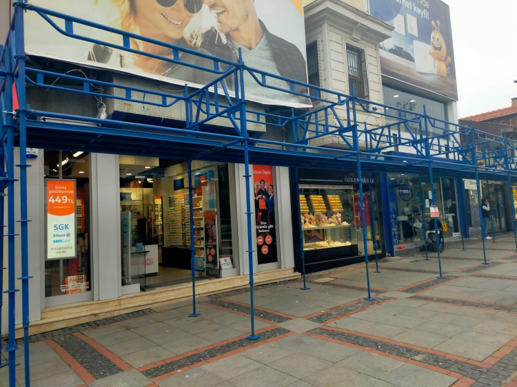 Yaklaşık 2 ay süren çalışmalar çerçevesinde, 25 iş yerinde bakım onarım çalışması devam ediyor. Bu iş yerlerinde ki çalışmalarda sona gelinmesiyle birlikte, bugün 13 iş yerinin girişine daha iskele kuruldu. Ayrıca iş yerlerinin tabelaları da söküldü.