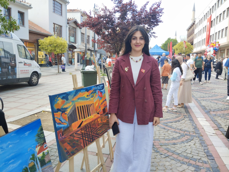 Edirne’de 19 Mayıs Atatürk’ü Anma Gençlik ve Spor Bayramı etkinlikleri kapsamında Trakya Üniversitesi öğrencilerinin yaptığı resimlerden oluşan sergi açıldı. Trakya Üniversitesi Güzel Sanatlar Fakültesi’nden eğitim görevlisi Şeyda Canpolat öncülüğünde, üniversite bünyesinde birçok farklı bölümlerde okuyan öğrencilerin yaptığı resimler sergilendi. Saraçlar Caddesi’nde açılan sergideki resimlerde birçok farklı konunun ele alındığını belirten Canpolat; “Gençlerin hepsi üniversitede farklı bölümlerde öğretim görüyorlar ve burada resimlerini sergiliyorlar. Öğrencilerimizin hepsi, özgün, yeni bir iş çıkardılar, kısa zamanda güzel resimler yaptılar. Sergimizdeki resimlerde Türk kültürüne ait simgeler, Atamızın resimleri, Anıtkabir var. Tıp Fakültesi öğrencilerimizin Rıfat Osman resimleri var. Edirne için Mimar Sinan, Fatih Sultan Mehmet, Edirne manzaraları gibi birçok farklı konu resmedildi” dedi.