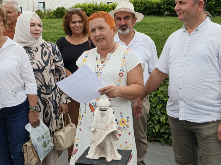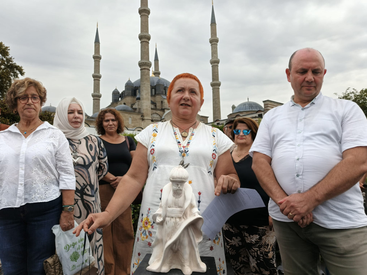Selimiye Camii meydanında düzenlenen basın açıklamasını EKK Yürütme Kurulu Üyesi Nalan Şahin Tabakoğlu okudu. Tabakoğlu, basın açıklamasından önce alana Mimar Sinan heykeli getirirken; heykelin gözlerinin siyah kurdele ile bağlı olması dikkat çekti.