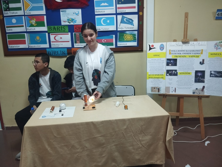 Tesla Bobininin yaydığı manyetik alan sayesinde elektrikli aletlerin kullanımın kablosuz bir şekilde yapılacağı çalışmasıyla fuara katılan Elif Sena Tirfil ise “Biz bu projemizde elektriğin kablosuz bir şekilde elektrikle çalışan eşyaları çalıştırmasını amaçladık. Bunu Tesla Bobiniyle yapıyoruz. Tesla Bobini bir direk etrafına sarılmış bakır tellerden oluşuyor. Buna pil yardımıyla elektrik verildiği zaman bir elektromanyetik alan oluşturuyor. Elektrikle çalışan bir ampulü bu elektromanyetik alanın içerisine yerleştirdiğim zaman elektrik akımı ampulün içine giriyor ve ampulün çalışmasını sağlıyor. Bu projede elektrikle çalışan cihazların kablosuz bir şekilde hava yardımıyla çalıştırılabilmesi amaçlanıyor” dedi.