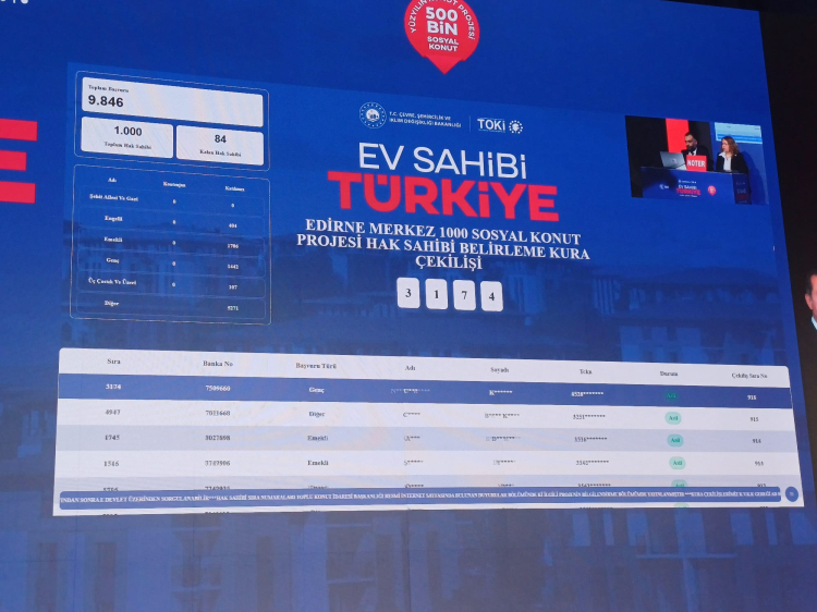 Toplu Konut İdaresi Başkanlığı (TOKİ) tarafından Edirne’de gerçekleştirilen konut kura çekimi, Çevre, Şehircilik ve İklim Değişikliği Bakanı Murat Kurum’un butona basması ile başladı. KVKK kuralları gereği kişisel bilgiler açıklanmadan kura çekimi gerçekleştiriliyor.