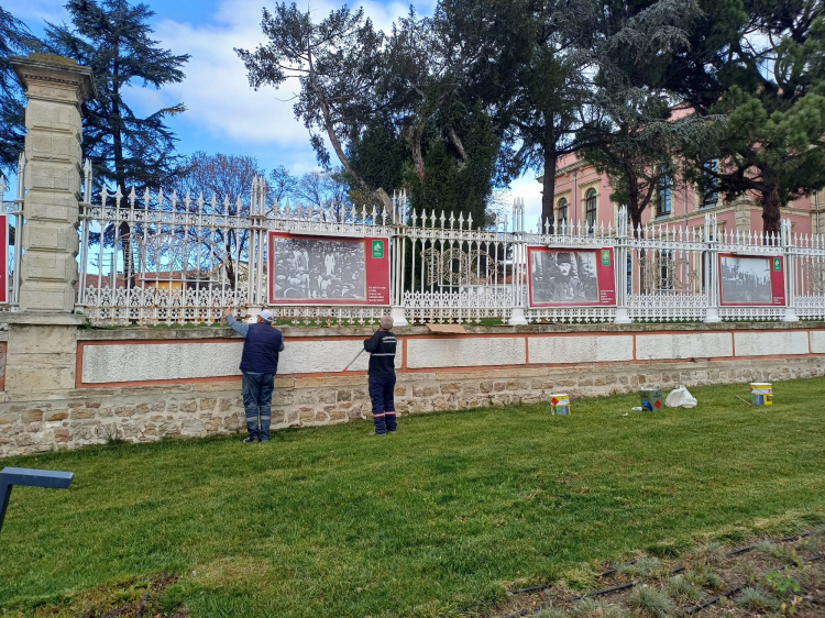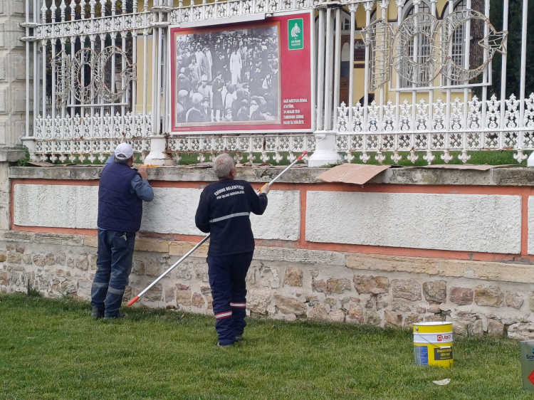 Edirne Belediyesi Fen İşleri Müdürlüğü ekipleri, kentin önemli yapıları arasında yer alan tarihi belediye binasında yenileme çalışmaları başlattı. Çalışmalar kapsamında, Atatürk’ün Edirne ziyaretine ait fotoğrafların sergilendiği bahçe duvarı parmaklıkları, ekipler tarafından temizlenerek yeniden boyanıyor.