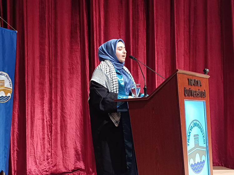 Törene damga vuran ise fakülte birincisi Hümeyra Yıldız’ın anlamlı konuşması oldu. Mezuniyet heyecanını ailesi, arkadaşları ve akademisyenlerle paylaşan Yıldız, konuşmasının son bölümünde Filistin'de yaşanan zulme dikkat çekerek duygusal anlar yaşattı. Yıldız konuşmasında, “Bugün burada mezuniyet sevincimizi yaşarken kalbimizin bir yanında elbette Filistinli kardeşlerimiz var. Filistin topraklarında her gün onlarca, yüzlerce insan zulme uğruyor, can veriyor. Bizler Müslümanlar olarak mazlumun yanında, zalimin karşısındayız" ifadelerini kullandı.