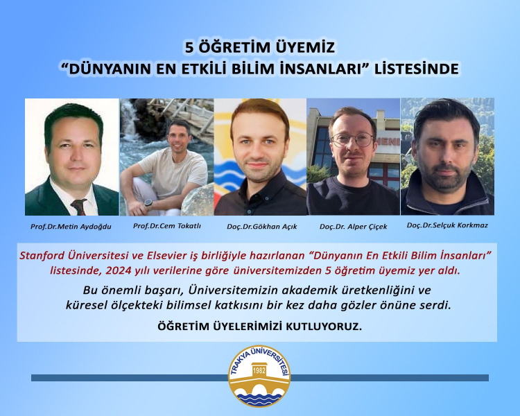 Trakya Üniversitesi, akademik başarılarını uluslararası platformda bir kez daha kanıtladı. Stanford Üniversitesi ve Elsevier iş birliğiyle hazırlanan “Dünyanın En Etkili Bilim İnsanları” listesinde, 2024 yılı verilerine göre Trakya Üniversitesi’nden 5 öğretim üyesi yer aldı.