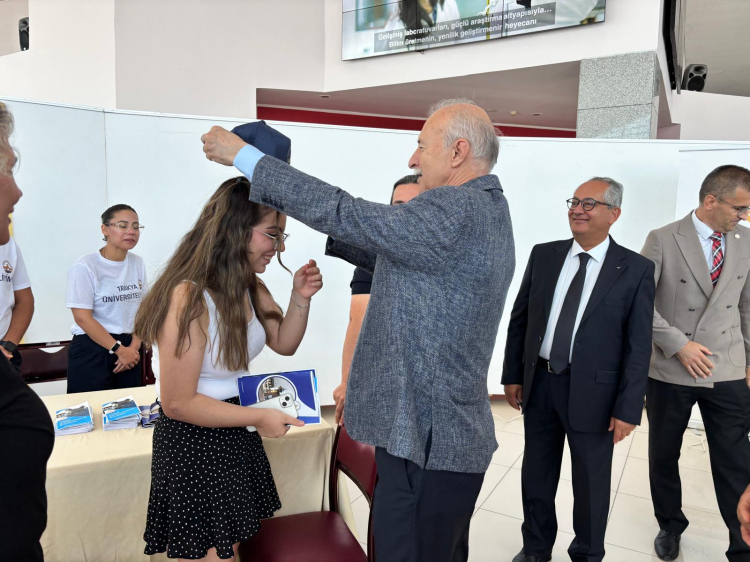 Tıp fakültesini görmek üzere ailesiyle birlikte Yapar’a Rektör Hatipler, üzerinde üniversitenin adı yazan şapka hediye etti ve Yapar Ailesiyle hatıra fotoğrafı çektirdi.