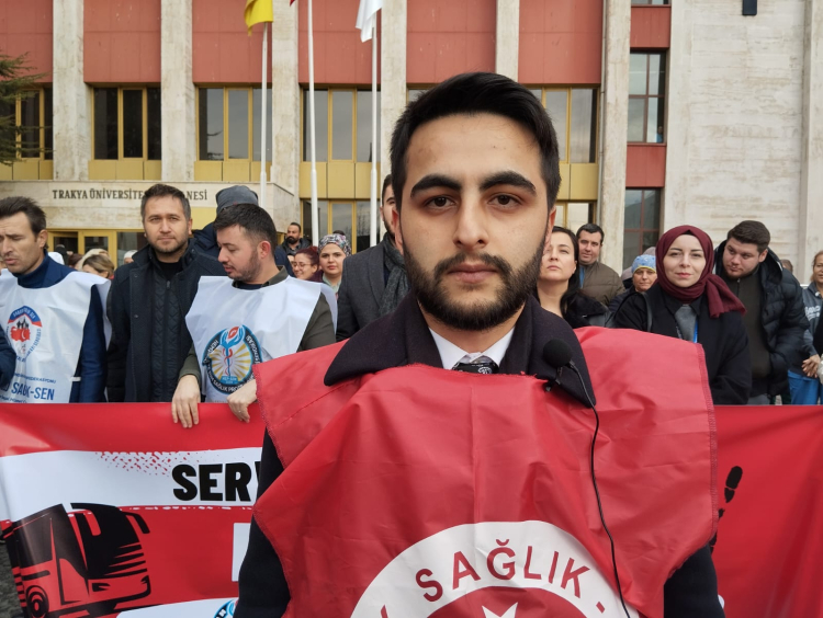 Edirne'de Trakya Üniversitesi Rektörlüğün yeni yıl itibariyle çalışan personel için servis araçlarını kaldırmasına tepkiler sürüyor. Bugün Hep-Sen, Türkiye Sağlık ve Sosyal Hizmet İşçileri Sendikası, Türk Sağlık-Sen, Anadolu Sağlık-Sen üyesi çalışanlar ortak basın açıklaması düzenledi. Basın açıklamasını Türk Sağlık-Sen Edirne Şube Başkan Yardımcısı Muhammed Esen okudu. Açıklamada servislerin çalışanların hakkı olduğunu belirterek, kaldırılmasını eleştirdi.