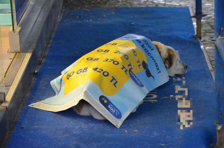 Köpeğin üşüdüğünü gören esnaflar, dükkânlarında bulunan bir afişi alarak köpeğin üzerine örttü. O anlar çevredeki vatandaşların da takdirini topladı.