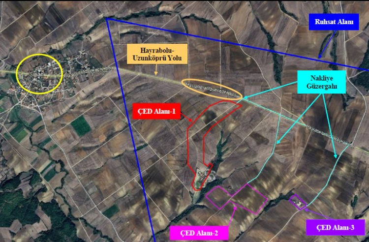 Tapu ve Kadastro Genel Müdürlüğü Parsel Sorgulama Uygulamasına göre toplam 24,95 hektarlık ÇED alanının tamamının tarla niteliğinde kaldığına yer verilen dosyada, Edirne İli 1/25.000 ve 1/100.000 Ölçekli Çevre Düzeni Planı’nda da ÇED alanının tarım arazisi lejantında kaldığı belirtildi.