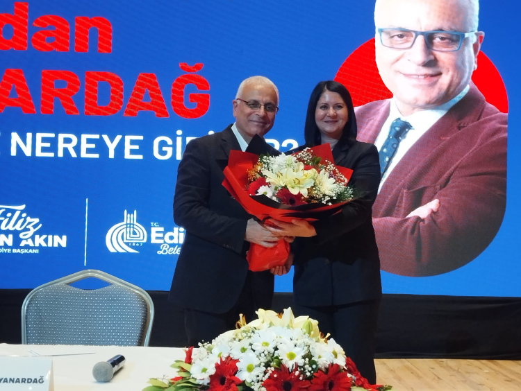 Söyleşiden sonra Edirne Belediye Başkanı Filiz Gencan Akın, Merdan Yanardağ’a çiçek vererek Edirnekari çalışması ve 11 Kasım 1938 tarihli Cumhuriyet Gazetesi’nin bir kopyasını hediye etti.