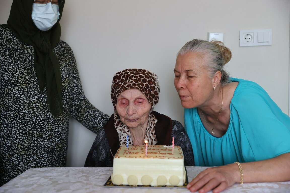 Yılmaz için birlikte yaşadığı kızı Nurten Şahin'in evinde düzenlenen kutlamada, "Ninemiz 100 yaşında, nice senelere" yazılı doğum günü pastası hazırlandı.