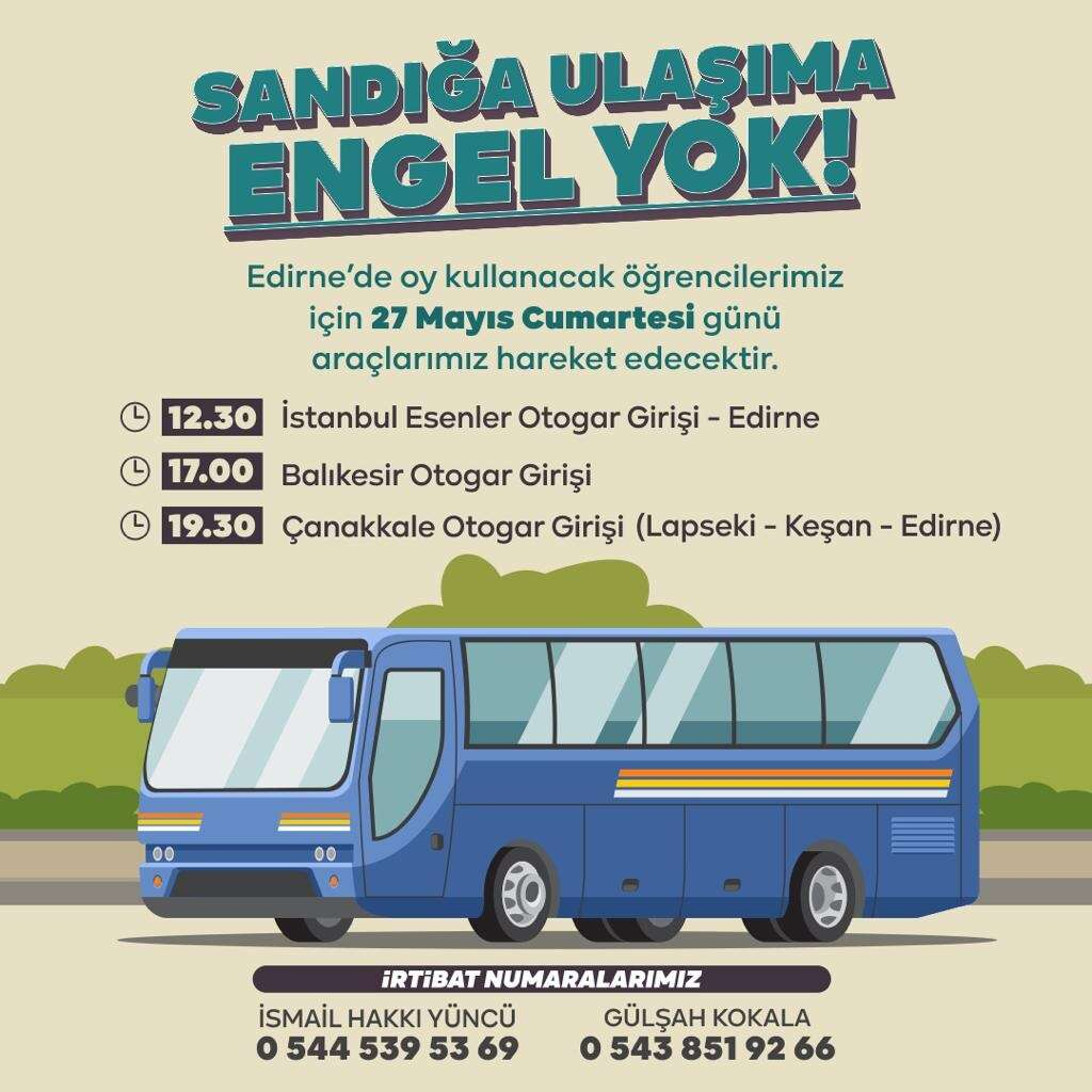 Öte yandan Edirne Belediyesi, şehir dışında okuyan öğrenciler için de ulaşım desteği verecek. Çanakkale, İstanbul ve Balıkesir’de okuyan ve Edirne’de oy kullanacak öğrenciler için de ücretsiz ulaşım desteği sağlanacak. Öğrenciler için 27 Mayıs Cumartesi Günü İstanbul Esenler Otogar Girişi, Balıkesir Otogar Girişi ve Çanakkale Otogar Girişinden Edirne’ye ücretsiz otobüsler hareket edecek. Bu şehirlerden Edirne’ye oy kullanmak için gelecek olan öğrenciler, 0544 539 53 69 ve 0543 851 92 66 numaralı hattı arayarak bilgi alabilir ve rezervasyon yaptırabilir.