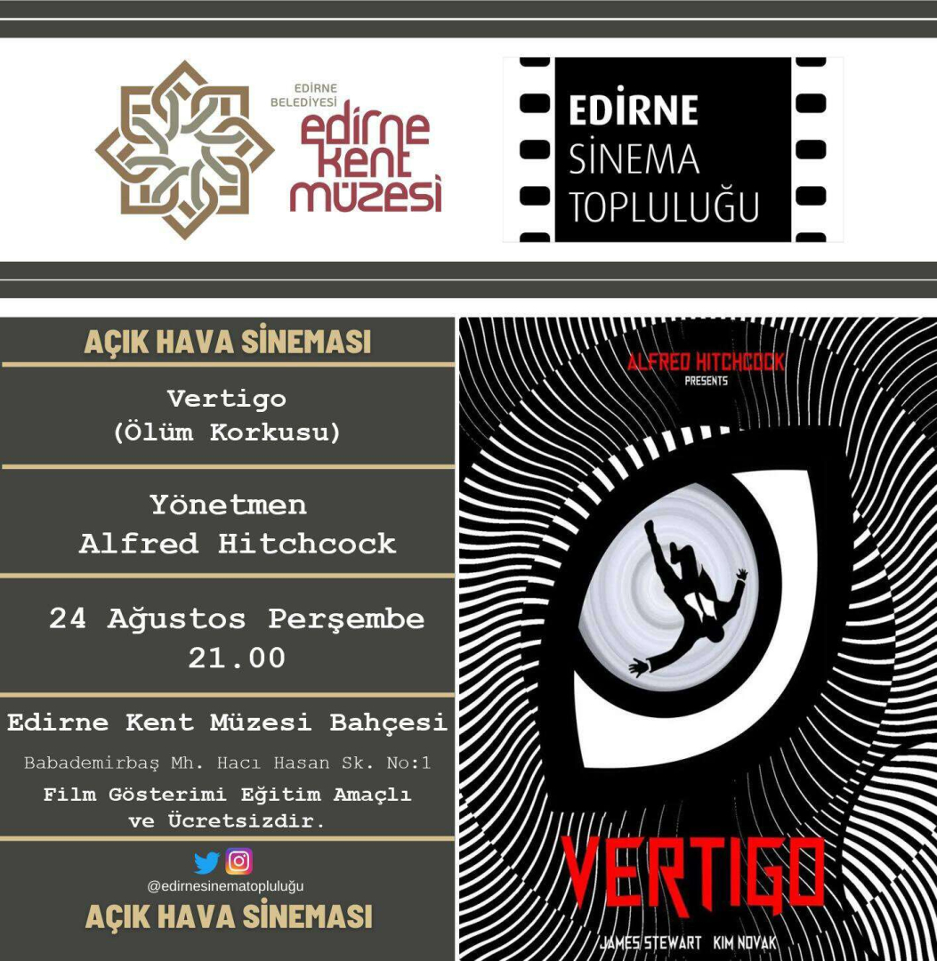Film gösteriminin ardından okumasının da yapılacağı etkinlikle ilgili Edirne Sinema Topluluğu’ndan yapılan açıklamada; “Edirne Sinema Topluluğu, Alfred Hitchcock Gecesi’ni iftiharla sunar. Yazlık sinema film gösterimleri gerilimin efendisi (master of horror) Alfred Hitchcock’la devam ediyor. Çektiği filmlerle adını sinema tarihine altın harflerle yazdıran, yapıtları pek çok sinemacıya ilham kaynağı olmuş usta yönetmenin önemli yapıtlarından Vertigo (Ölüm Korkusu) izleyici karşısında olacak. Gerilim ve gizemin iç içe geçtiği, sürükleyici öyküsüyle canlılığını diri tutan bu başyapıt, 24 Ağustos Perşembe akşamı saat 21.00’de Edirne Kent Müzesi bahçesinde olacak.
