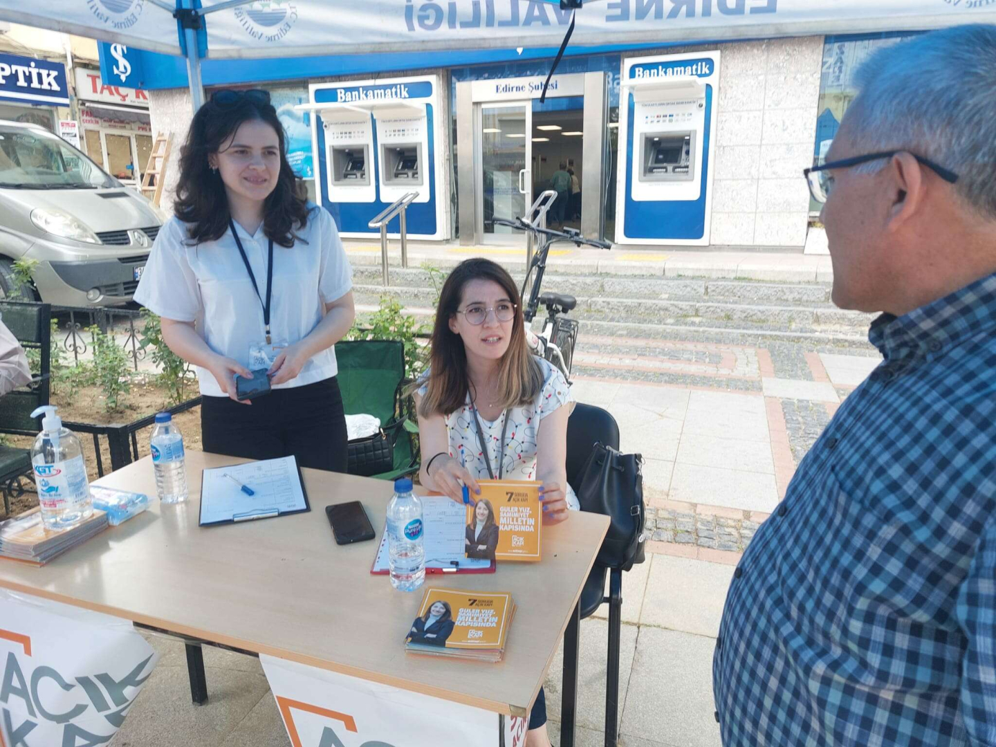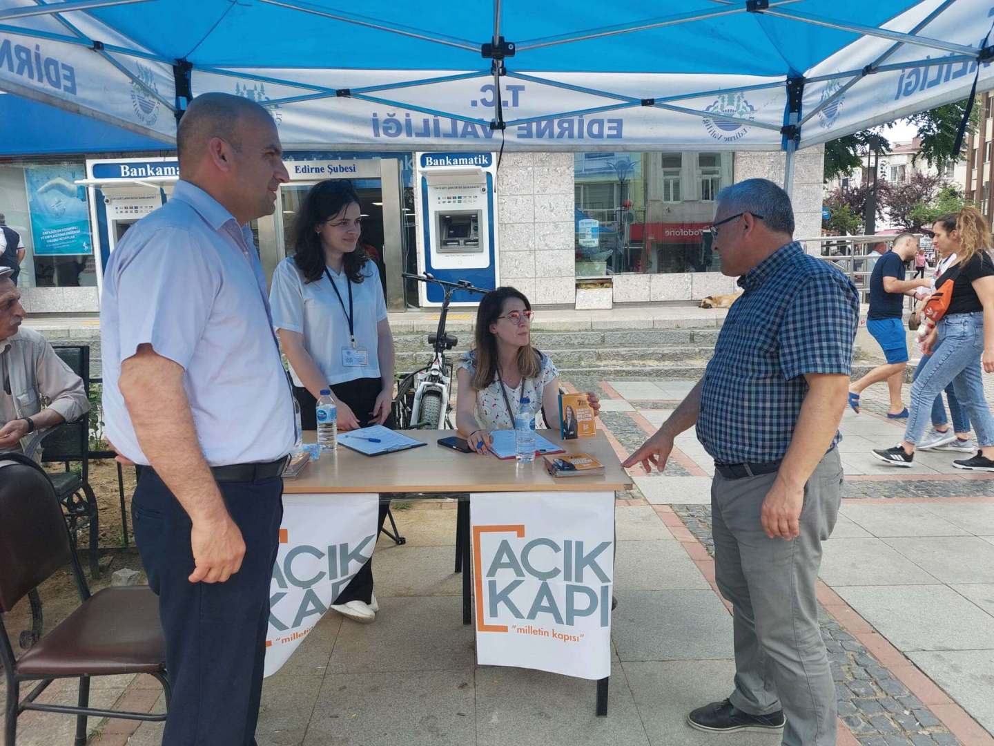 Edirne’de Valilik ve Kaymakamlıkların vatandaşların taleplerini ve önerilerini Saraçlar Caddesi’nde dinleyerek vatandaşlara Açık Kapı hakkında bilgilendirme yaparak broşür dağıtımı gerçekleştiriyor. Vatandaşların sorunlarını ve taleplerini doğru yere aktarma konusunda köprü vazifesi gören Açık Kapı birimleri Sosyolog Neslihan Akkan ve Sosyal Hizmetler Uzmanı Ebru Gal, Saraçlar Caddesi’nde saat 17.00’ye kadar hizmet verecek.
