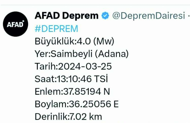 Afet ve Acil Durum Yönetimi (AFAD) Başkanlığının internet sitesinde yer alan bilgiye göre, merkez üssü Saimbeyli ilçesi olan 4 büyüklüğündeki sarsıntının 7,02 kilometre derinlikte meydana geldiği belirlendi.