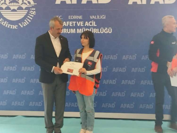 Edirne’de eğitimlerini tamamlayan Destek AFAD gönüllüsü 14 kişiye sertifikaları Edirne Valisi Yunus Sezer tarafından verildi.