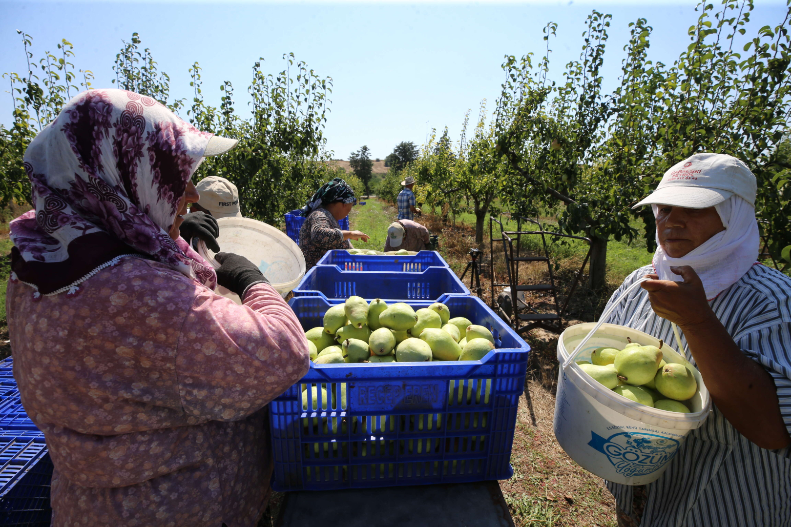 Sabahın ilk ışıklarıyla mesaiye başlayan mevsimlik işçiler, merdiven yardımıyla ağaçlardan topladıkları meyveleri kasalara diziyor. Zaman zaman sıcak havadan bunalan kadınlar, kısa molalarla ağaç gölgelerinde dinleniyor.