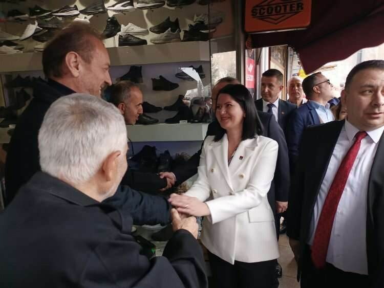 Konuşmaların ardından programa katılan CHP heyeti, Akın ile birlikte Saraçlar Caddesi’ndeki esnafı tek tek ziyaret etti.