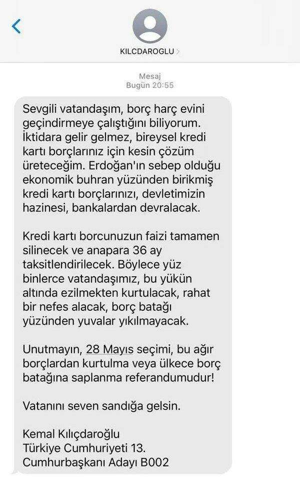 CHP Genel Başkanı ve 7'li koalisyonun cumhurbaşkanı adayı Kemal Kılıçdaroğlu, vatandaşların cep telefonlarına, kredi kartları borçlarını çözeceğini söylediği bir kısa mesaj gönderdi, mesajda şu ifadeler yer aldı: