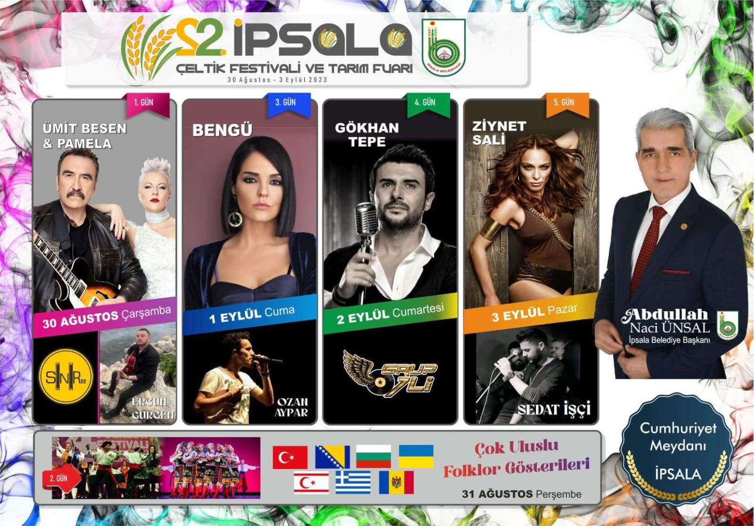 30 Ağustos – 3 Eylül tarihleri arasında düzenlenecek festivalin ilk gününde Sınır 22, Ergun Gürgen, Ümit Besen ve Pamela, ikinci gününde çok uluslu folklor gösteri ekipleri, üçüncü gününde Ozan Aypar ve Bengü, dördüncü gününde Grup 7’li ve Gökhan Tepe, son gününde ise Sedat İşçi ve Ziynet Sali sahne alacak. Cumhuriyet Meydanı’nda düzenlenecek festival, 30 Ağustos Çarşamba günü saat 17.00’de kortej yürüyüşü ile başlayacak.