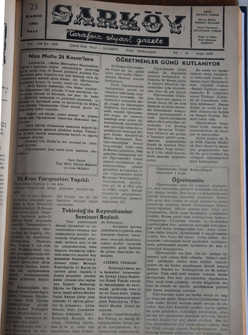 Şarköy gazetesinin 23 Kasım 1982'de çıkan sayısının birinci sayfasında da yayınlanan kompozisyon, şehit öğretmen Neşe Alten'in ilkokul öğretmeni Şennur Kutman'a ve öğretmenlik mesleğine hayranlığını gözler önüne seriyor.