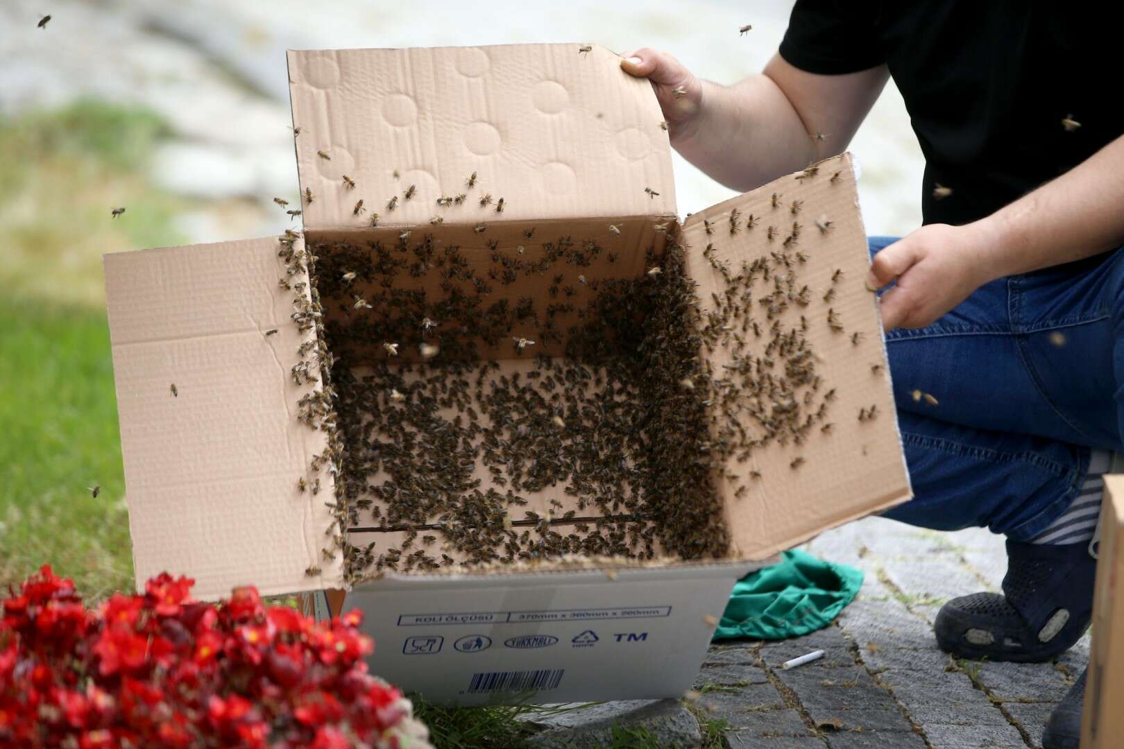 Solak, bitki üzerindeki kraliçe arı ve arıların büyük bir kısmını karton kutuya alarak yerdeki arı kovanının içine koydu.