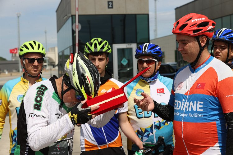 Sınır kapısında düzenlenen törende Türk bayrağına sarılı toprak, Bisiklet Federasyonu Edirne Temsilcisi Utku Zorlutuna'ya teslim edildi.