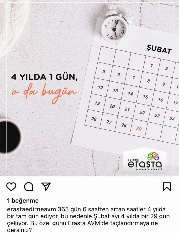 Edirne'deki bir alışveriş merkezi yönetimi, sosyal medya hesabı aracılığıyla Edirnelileri 4 yılda bir denk gelen 29 Şubat gününde alışveriş merkezlerini ziyaret etmeye davet etti.