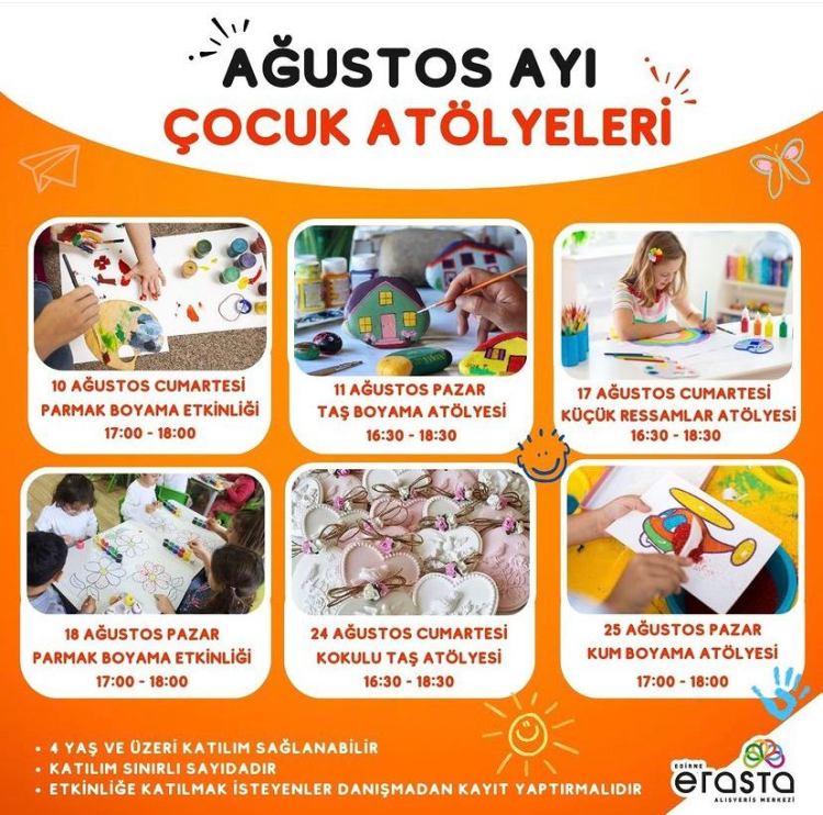 Edirne ‘de bir alışveriş merkezi, Ağustos ayında çocuklar için birbirinden eğlenceli atölyeler düzenliyor. Her biri çocukların yaratıcılığını ve el becerilerini geliştirmeye yönelik olan bu atölyeler, 4 yaş ve üzeri çocukların katılımına açık. Etkinlikler sınırlı sayıda katılımcı ile gerçekleştirileceğinden, ilgilenenlerin önceden danışma noktasından kayıt yaptırmaları gerekiyor.