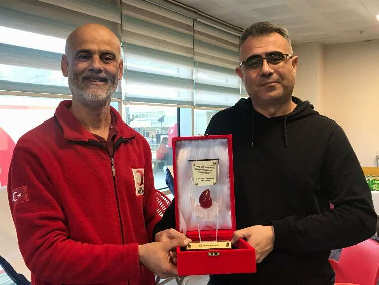 Aksoy, Ozan Aydoğdu nezdinde tüm vatandaşları kan bağışına davet ettiğini belirterek “Ozan Aydoğdu bizim sürekli çok duyarlı bağışçılarımızdan. Biz Kızılay olarak 10. bağışını yapmış vatandaşlara bronz madalya, 25. bağışını yapmış olan bağışçılarımıza gümüş madalya, 35. Bağışını yapmış olan bağışçılarımıza altın madalya, 45 ve üzerindeki kan bağışı yapmış bağışçılarımıza ise plaket hediye ediyoruz. Biz genelde bağışçılarımızla tanış olmaya başlarız. Ozan Beyle de sürekli görüştüğümüz için burada çalıştığını biliyorduk. Burası ona özel değildi ama biz organizasyonumuz içerisinde onunda burada çalıştığını bilerek bir jest yapmak istedik. Böyle bir organizasyon içerisine girdik ve kendisine plaketini bugün burada 57. bağışını yaptığı için de takdim ettik. Umarım Ozan Bey nezdinde tüm vatandaşlarımızı da kan bağışına davet etmiş oluruz” diye konuştu.