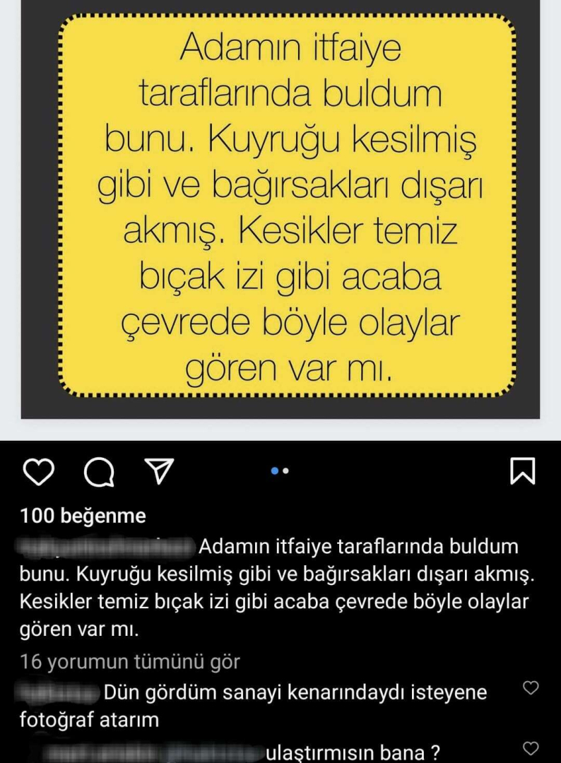 Yaşanan olayın bilinçli olarak yapılmış olduğuna değinen Bir El Bin Nefes Derneği Başkanı Yağmur Islattı Aydın “Aynı anda bağırsakların dışarıda olması ve kuyrukta kesik izinin olması araba çarpmasından ziyade kasıtlı olarak yapıldığını düşündürüyor beni. Sadece kuyruk olsa belki daha önce bir operasyon ile kesildi o şekilde olabiliyor çünkü. O şekilde hayatlarına devam edebiliyorlar ama iki tarafın o şekilde oluşu muhtemel olarak canice işlenmiş olan bir cinayet. Bana bilinçli yapılmış gibi geldi açıkçası. Biz daha önce böyle bir olay başımıza geldi ama o zehirlenmeydi. Burada direkt olarak hayvanı kesmişler” dedi.