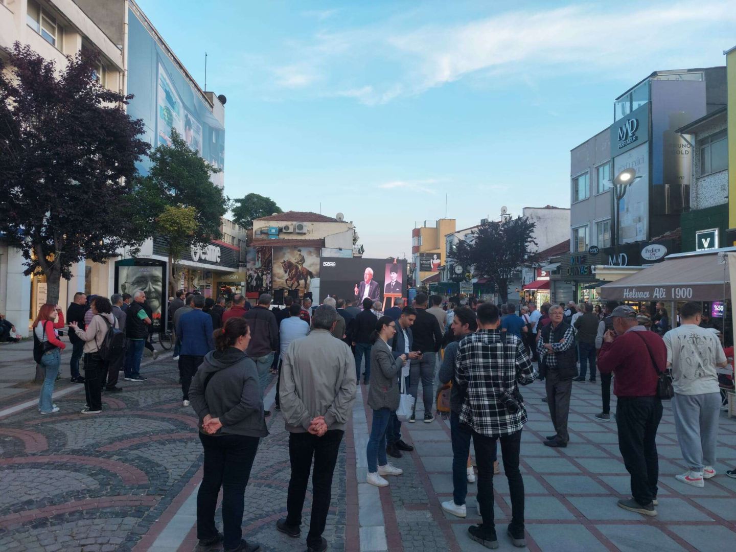 Programa katılan CHP Edirne İl Başkanı Samet Kahraman, CHP Edirne Merkez İlçe Başkanı Olcay Bakkalcı, partililer ve vatandaşlar caddeye kurulan ekranda programı izledi.