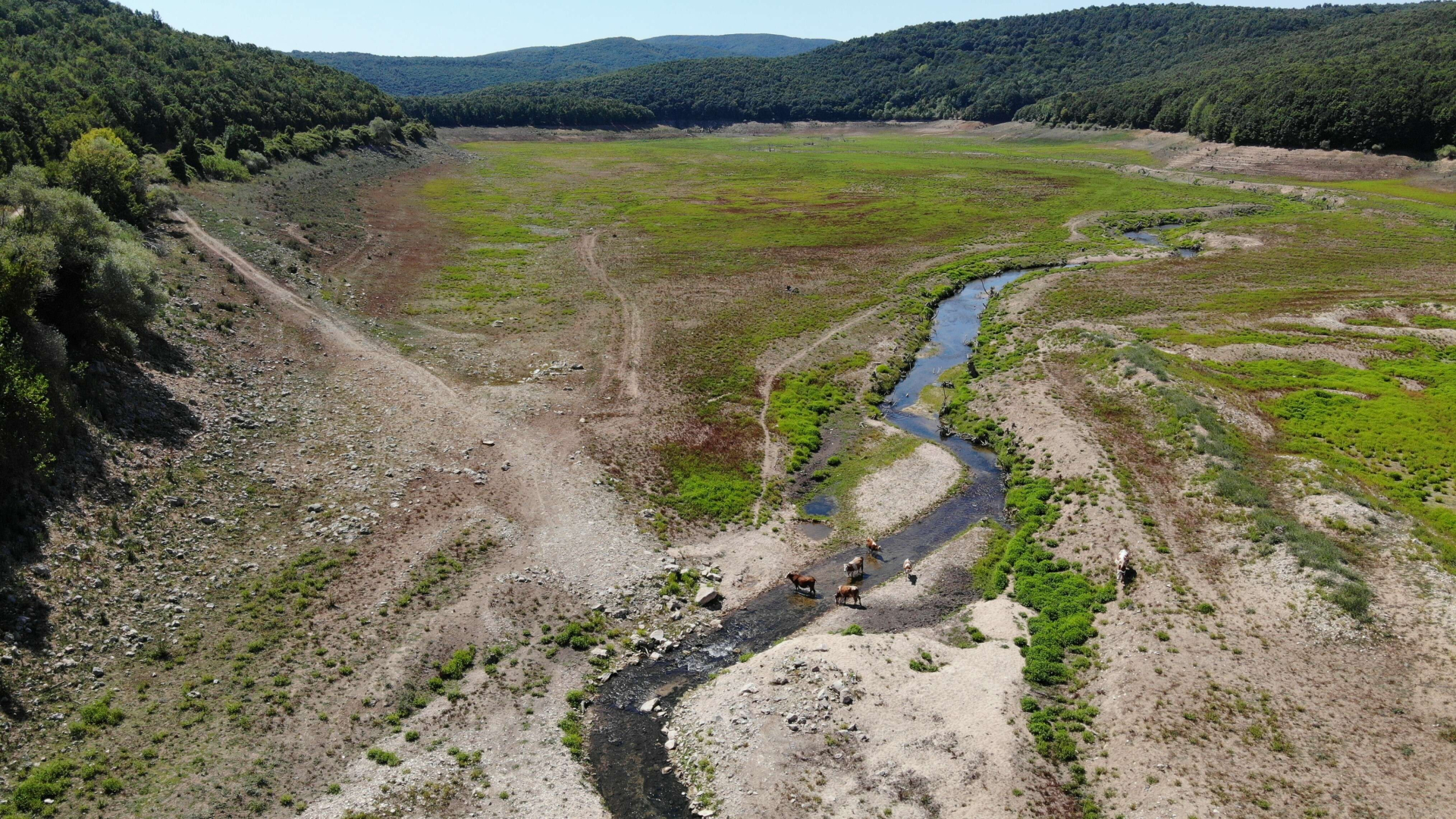 Kırklareli’nin Vize ilçesinde bulunan ve İstanbul’un su ihtiyacının karşılayan Kazandere ve Papuçdere Barajları kurudu. Kuruyan barajların yüzeyi otlarla kaplanıp yeşil renge bürünürken, hayvanlar suyun çekildiği alanlarda otluyor.