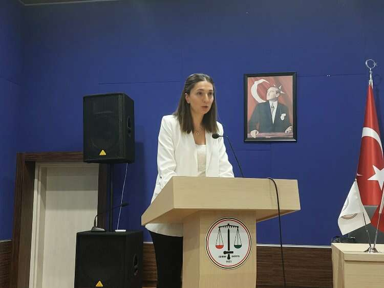 Edirne Baro Başkanvekili Av. Aygün Ulubey Ergüden yaptığı konuşmada meslektaşlarının karşılaştığı dava türlerinden olan iş kazası ve meslek hastalıklarından kaynaklanan tazminat davalarını değerlendirmenin tüm meslektaşları adına yarar sağlayacağını belirtti.