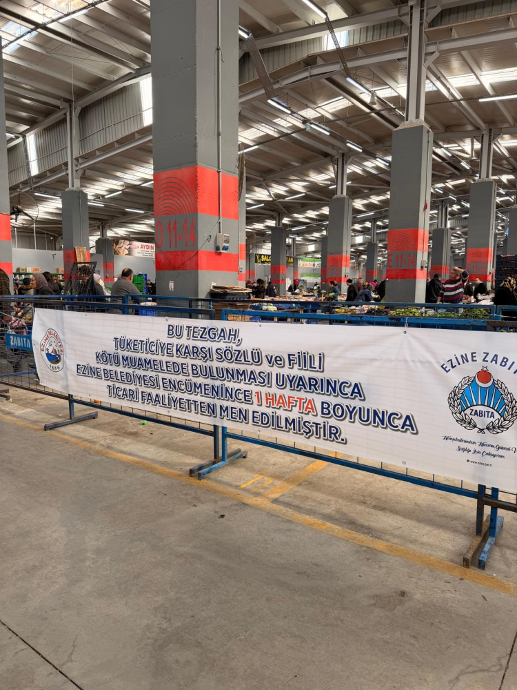 Ezine'de pazar yerinde olayın yaşandığı tezgahın olduğu alana Ezine Belediyesi zabıta ekipleri tarafından "Bu tezgah tüketiciye karşı sözlü ve fiili kötü muamelede bulunması uyarınca Ezine Belediyesi Encümenince 1 hafta boyunca ticari faaliyetten men edilmiştir" yazısı asıldı.