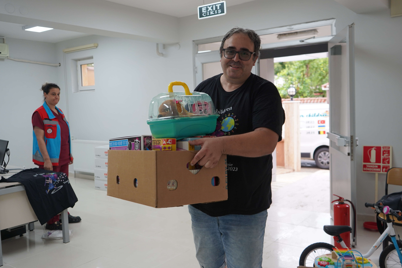 Ecza deposu bulunan Bermaund, dezavantajlı çocuklar için getirdiği oyuncak ve çeşitli hediyeler ile üzerinde "Çocuklar için oyuncak" yazılı tişörtleri ekiplere teslim etti.