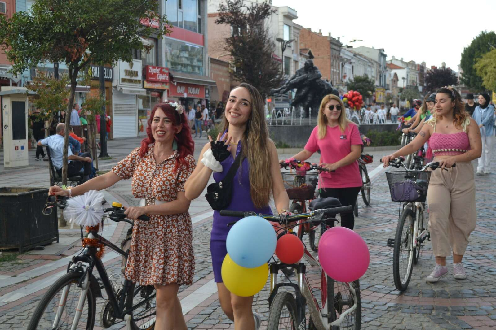 Bisikletlerini süsleyen, güne özel rengarenk kıyafetler giyen ve renkli makyajlarıyla dikkat çeken kadınlar, Atatürk Anıtı’nda bir araya gelerek, Süslü Kadınlar Bisiklet Turu’nu başlattılar. Edirne Belediye Bandosu’nun çaldığı şarkılarla dans eden kadınlar, müzikli eğlencenin ardından basın açıklaması yaparak bisiklet kullanımının önemine dikkat çektiler.