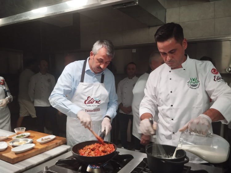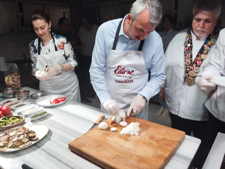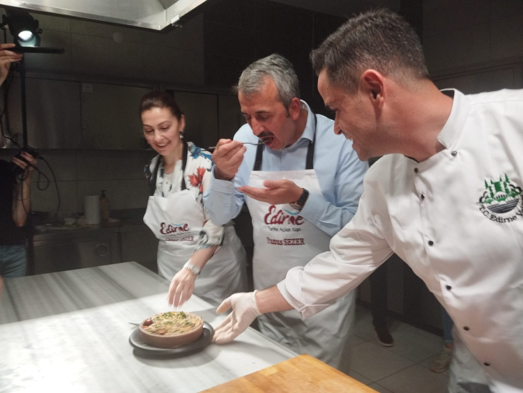 Edirne yöresine ve Saray Mutfağı’na ait, birçoğu kaybolmaya yüz tutmuş 90’dan fazla yemekten oluşan “Topraktan Tabağa Edirne Yemekleri” kitabı için çekimler yapılıyor. Karaağaç’ta bulunan Lalel Kafe mutfağında gerçekleştirilen çekimlere Edirne Valisi Yunus Sezer ve eşi Canan Sezer de katılarak yemek pişirdiler. Yaklaşık 3 ay boyunca bütün köyler gezilerek, oralardaki yaşlılarla konuşularak kitabın envanterinin oluşturulduğunu belirten Vali Sezer, “Bugün ilimiz açısından bizleri de son derece mutlu eden bir proje için Karaağaç'ta bulunuyoruz. Birbirinden değerli aşçılarımız ve hocalarımızla beraber, Edirne'mizin tarihten bu tarafa gelen hem Rumeli Mutfağı hem de Saray mutfağını içerisine alan yemeklerinin çalışması yapıldı. Tabii burada çok önemli bir emek var. Yaklaşık üç aylık süre içerisinde bütün köyler gezilerek, oradaki unutulmuş yemeklerle ilgili olarak köylerimizde ve şehir içerisinde yaşlılarımızla röportajlar yapıldı, araştırıldı ve sonuçta çok güzel bir envanter ortaya çıkartıldı. Edirne'mizin, bazıları unutulmaya yüz tutmuş, hatta bazıları hiç pişirilmeyen yemekleri de olmak üzere 90’ın üzerinde yemek ve tatlı ortaya çıkarıldı. Bunlar araştırılarak, reçeteleriyle beraber, üniversitemizin desteğiyle, aşçılarımızın desteğiyle, hanımefendiyle beraber bir çalışma yapıldı. Şimdi de her gün bir yemeğe yine birbirinden değerli aşçılarımız, hocalarımız pişirerek, çekimlerini yaparak geleceğe çok güzel kültürel, gastronomik bir envanter bırakıyoruz. Eylül ayında da bunlar hem dijital ortamda hem de kitap olarak basımı yapılacak. Bu, Edirne’de olmayan bir şey. Eylül ayında da inşallah bunu büyük bir festivalle Edirne'mizde bütün vatandaşlarımıza sunmuş olacağız” şeklinde konuştu.