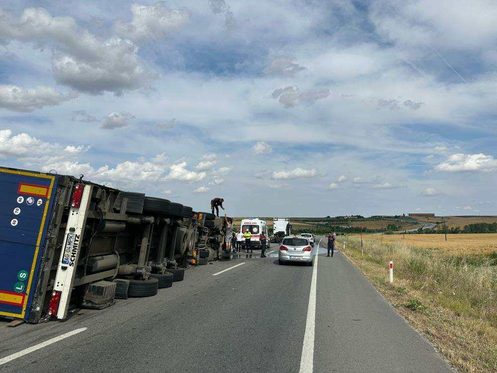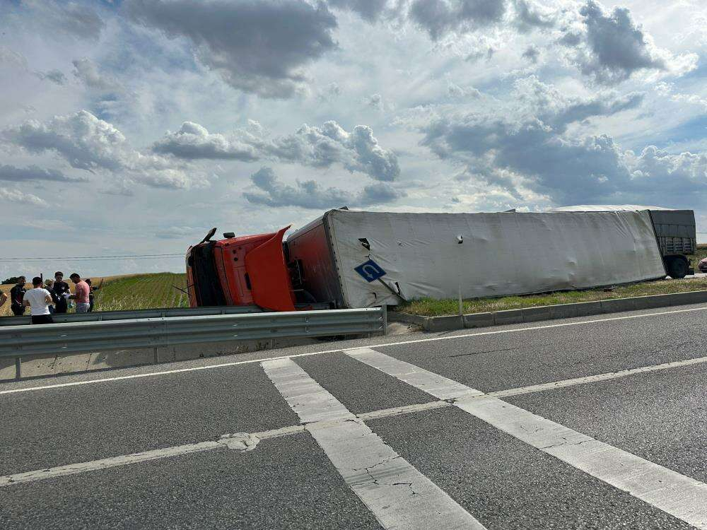 İstanbul istikametinden Edirne yönüne seyir halinde olan tır, sürücünün hakimiyetini kaybetmesi sonucu Havsa Abalar Sapağı'nda devrildi.