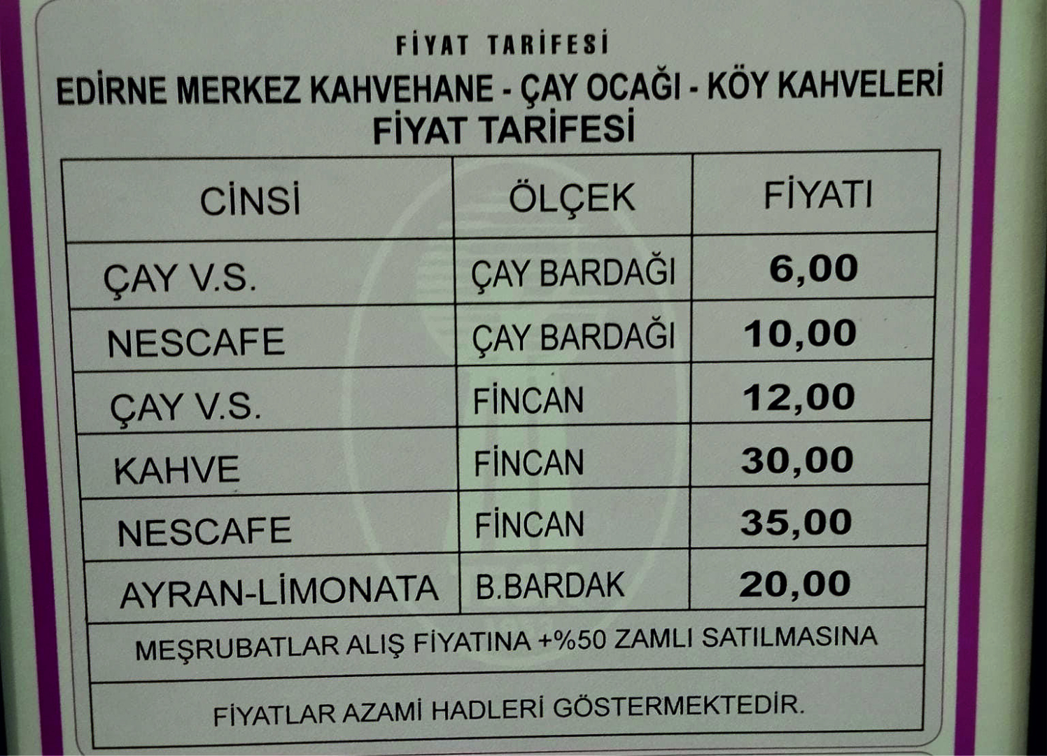 Yeni oluşan fiyatlarda, bardak nescafe 10 lira olurken, fincan çay 12 lira, kahve 30 lira, fincan nescafe 35 lira, ayran ve limonata ise 20 lira oldu. Yeni tarifeler çay ocakları ve kahvelere dağıtılmaya başlandı. Yeni fiyat tarifelerini alan esnaflar zamlı fiyatları uygulamaya başladı.