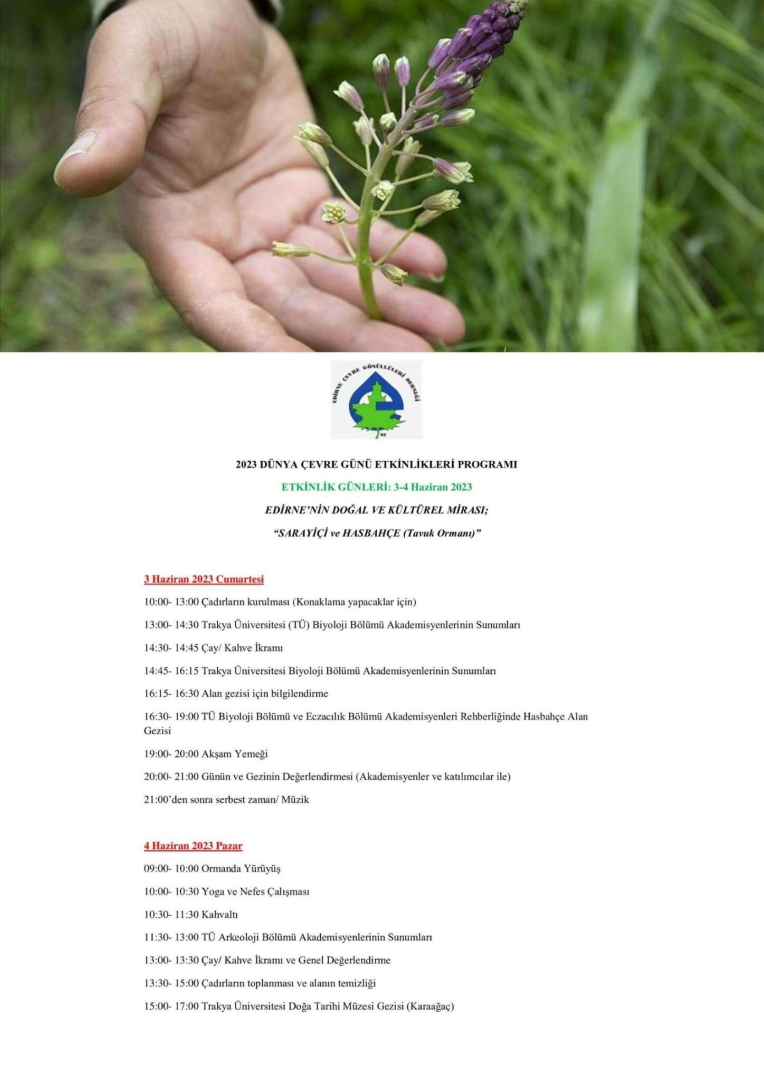 Edirne Çevre Gönüllüleri Derneği organizasyonuyla Dünya Çevre Günü etkinlikleri düzenlenecek. 3-4 Haziran 2023 tarihlerinde Edirne’nin Sarayiçi ve Hasbahçe’de (Tavuk Ormanı) toplanacak olan çevreciler, çadırlar kurarak burada konaklayacaklar.