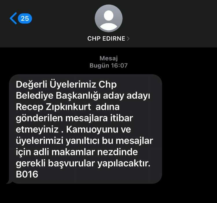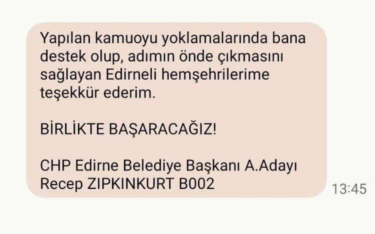 Zıpkınkurt, aday adayı sıfatıyla CHP üyelerine mesaj atarak teşekkür etmesine CHP Edirne İl Yönetimi yine SMS’le karşılık verdi. Parti yönetimi üyelere mesaj atarak Zıpkınkurt’un mesajlarına itibar edilmemesi uyarısında bulundu. İl yönetimi mesajda “Değerli üyelerimiz CHP Belediye Başkanlığı aday adayı Recep Zıpkınkurt adına gönderilen mesajlara itibar etmeyiniz. Kamuoyunu ve üyelerimizi yanıltıcı bu mesajlarla ilgili adli makamlar nezdinde gerekli başvurular yapılacaktır” ifadelerine yer verildi. CHP İl Yönetiminin attığı mesajdan konunun adli makamlara taşınacağı tahmin ediliyor.