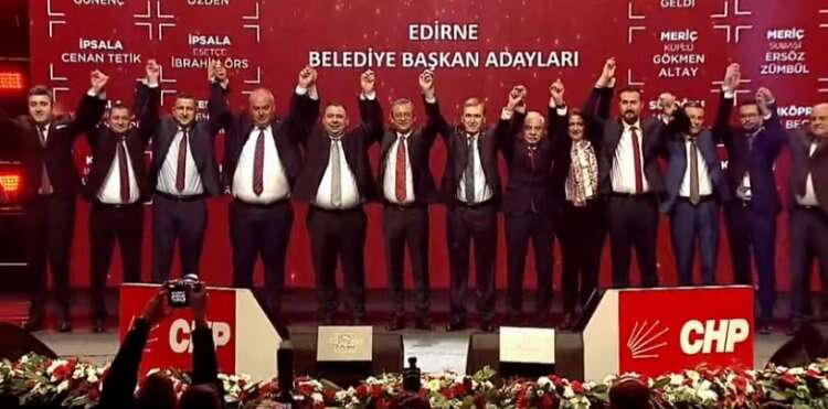 CHP Edirne Belediye Başkan adayı Şükrü Ciravoğlu, CHP Keşan Belediye Başkan adayı Mehmet Özcan, CHP Uzunköprü Belediye Başkan adayı Özlem Becan, CHP Havsa Belediye Başkan Adayı Hüseyin Özden, CHP İpsala Belediye Başkan adayı Cenan Tetik, CHP Süloğlu Belediye Başkan adayı Mehmet Ormankıran, CHP Lalapaşa Belediye Başkan adayı Zafer Sezgin Geldi, CHP Enez Belediye Başkan adayı Özkan Günenç, CHP Meriç Belediye Başkan adayı Erol Dübek, CHP Esetçe Belediye Başkan adayı İbrahim Örs, CHP Yenikarpuzlu Belediye Başkan adayı Ahmet Yeniköprü, CHP Beğendik Belediye Başkan adayı Muhammet Örnek, CHP Yenimuhacir Belediye Başkan adayı Tamer Kıral, CHP Küplü Belediye Başkan adayı Gökmen Altay, CHP Subaşı Belediye Başkan adayı Ersöz Zümbül ve CHP Kırcasalih Belediye Başkan adayı Hüseyin Tütüncü sahneye davet edildi.