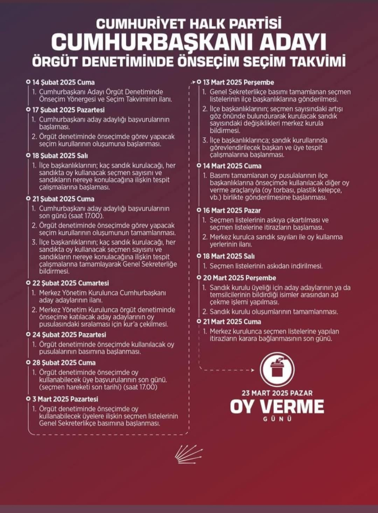 Cumhuriyet Halk Partisi (CHP) Genel Başkanı Özgür Özel’in duyurduğu Cumhurbaşkanı adayının üyelerin kullanacağı oylarla belirleneceği önseçimin takvimi belli oldu.