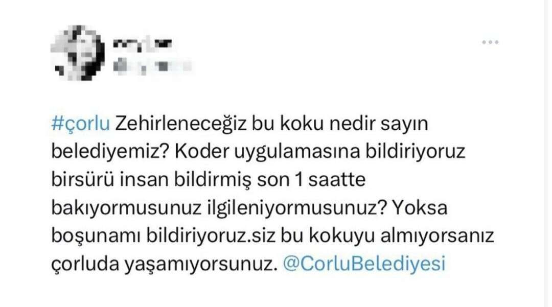 Dün gece itibari ile kokudan evlerinde oturamayan vatandaşlar seslerini sosyal medya üzerinden duyurmanın yollarını aradı. Vatandaşlar yetkililere seslenerek çözüm aradıklarını ifade ettiler. Yapılan bir paylaşımda “Zehirleneceğiz bu koku nedir sayın belediyemiz? Coder uygulamasına bildiriyoruz bir sürü insan bildirim yapmış, son bir saate. Bakmıyor musunuz, İlgilenmiyor musunuz? Yoksa boşuna mı bildiriyoruz? Siz bu kokuyu almıyorsanız Çorlu’da yaşamıyorsunuz” ifadelerine yer verildi.