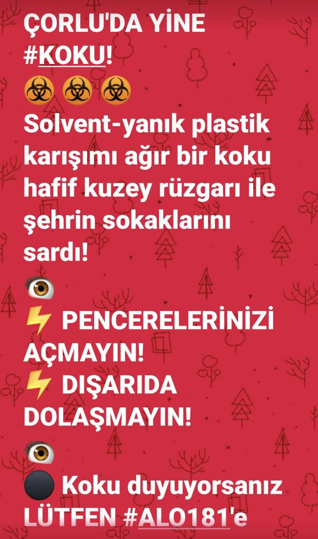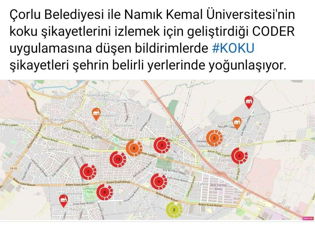 Dün akşamki kokunun çok şiddetli olduğuna değinen Sevgi “Bu seferki sorun bu zamana kadar yaşadığımız en ağır kokulardan birisiydi. Dayanılmaz bir kokuydu. Nefes ile ilgili sorunları olanlar ciddi rahatsızlıklar yaşadı. Bu sorunları olan vatandaşlar için ciddi bir risk gecesiydi. Şikayetler sosyal medya üzerinden yapıldığı gibi Çevre Şehircilik Bakanlığı Alo 181 hattına ve Çorlu Belediyesi ile Namık Kemal Üniversitesi’nin birlikte geliştirdiği şikayetleri toplamak üzere gerçekleştirilmiş olan ‘CODER’ adındaki cep telefonu uygulaması üzerinden de şikâyet yapanın yerini tespit ederek bir harita oluşturuluyor. Bu sistemle de bu şikayetler toparlandı. Bu şikayetler ile alakalı yetkili makam olan Çevre ve Şehircilik Müdürlüğü’nden bu kimyasal deşarjının kimler tarafından yapıldığı ile ilgili bir çalışma bekliyoruz” ifadelerine yer verdi.