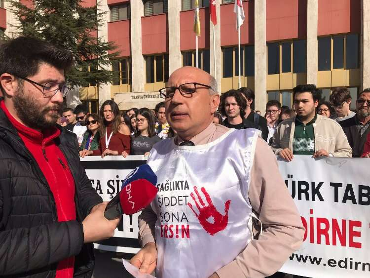 Basın açıklamasını okuyan Edirne Tabip Odası Şube Başkanı Prof. Dr. Gürcan Altun, Edirne Tabip Odası olarak meslektaşlarına yönelik gerçekleştirilen saldırıyı kınadıklarını söyledi. Güvenli çalışma ortamları ve etkili bir sağlıkta şiddet yasası istediklerini belirten Altun, sağlıkta şiddet konusunun Türkiye’de kanayan bir yara ve kronik toplumsal bir sorun haline dönüştüğünü ifade etti.