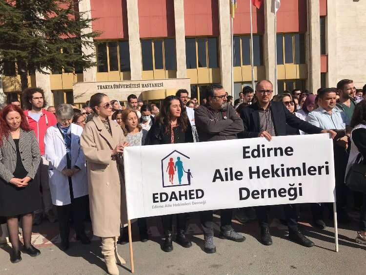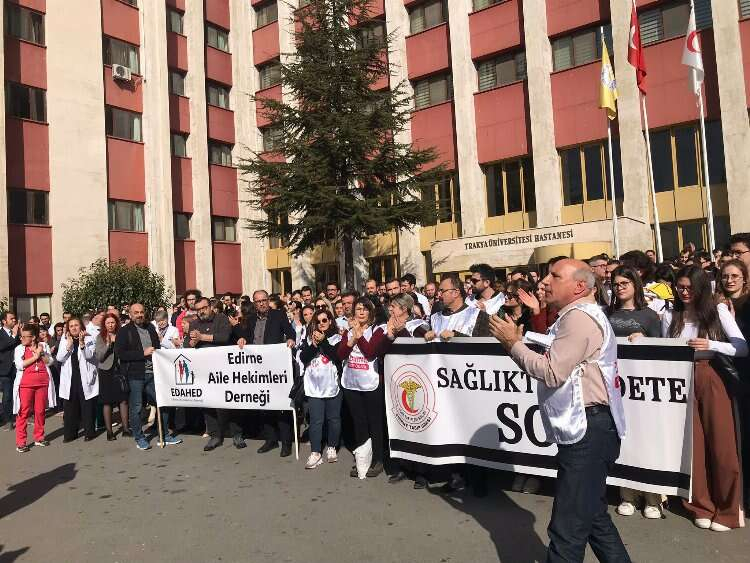 Edirne’de yaşanan sağlıkçılara yönelik şiddet bugün Trakya Üniversitesi Tıp Fakültesi Hastanesi önünde Edirne Tabip Odası Yönetim Kurulu’nun düzenlediği eylem ile protesto edildi. Edirne Aile Hekimleri Derneği, Hekim Birliği Sendikası Edirne Şubesi, Sağlık ve sosyal hizmet emekçileri sendikası Edirne Şubesinin katılımıyla gerçekleşen eylemde sağlık çalışanları, sağlıkta şiddetin sona ermesi için şiddete yönelik gerekli önlemlerin alınması için yetkililere sorumluluklarını hatırlattı.