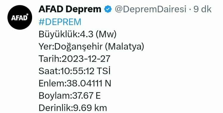 Afet ve Acil Durum Yönetimi Başkanlığı'nın (AFAD) verilerine göre, Malatya’da saat:10.55’te 4,3 büyüklüğünde bir deprem meydana geldi.