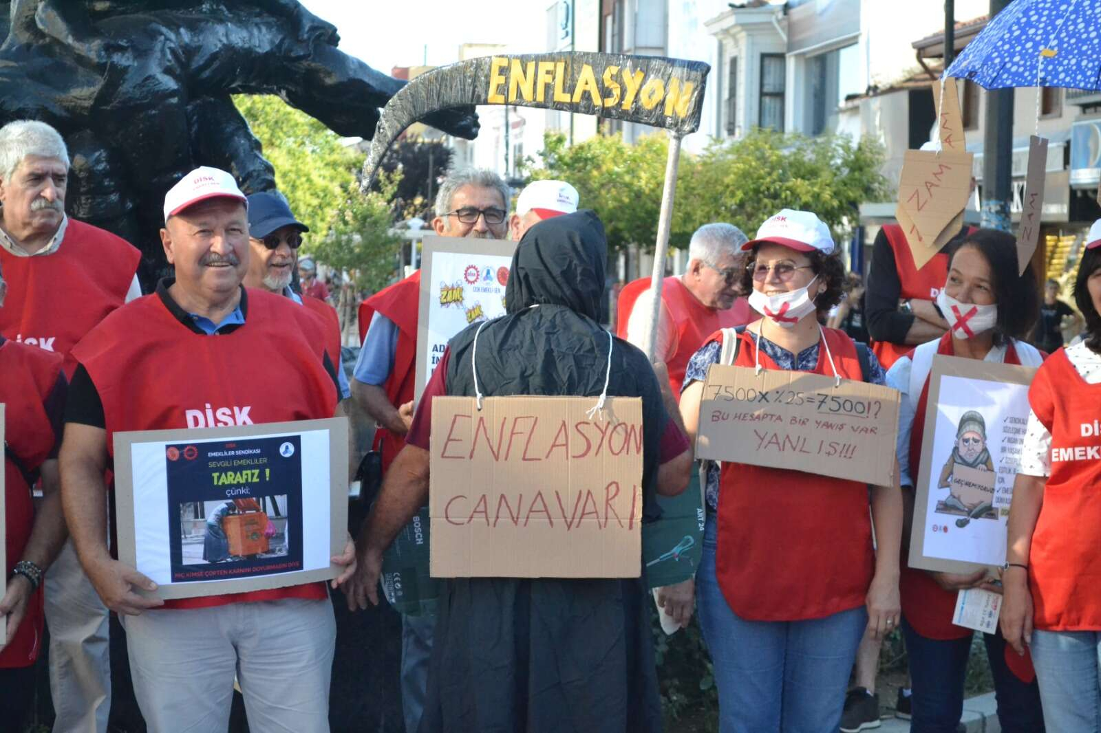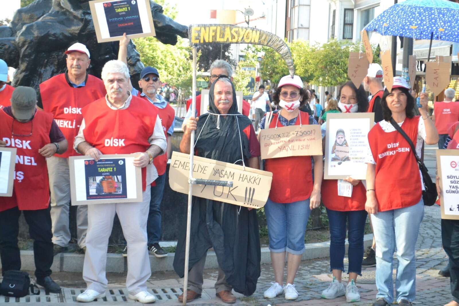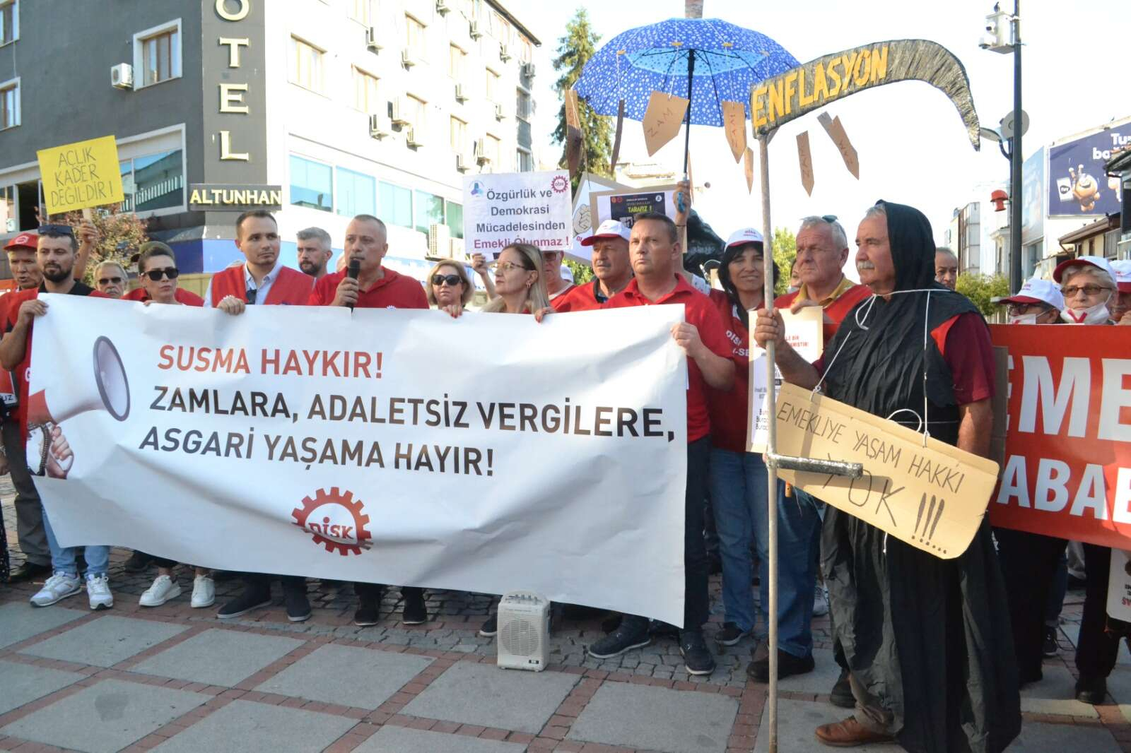 Açıklamaya, bir sendika üyesinin üzerinde ‘Enflasyon Canavarı’ yazan Azrail kostümü ile katılması dikkat çekti. Açıklamayı, DİSK Trakya Bölge Temsilcisi Salim Şen okudu.